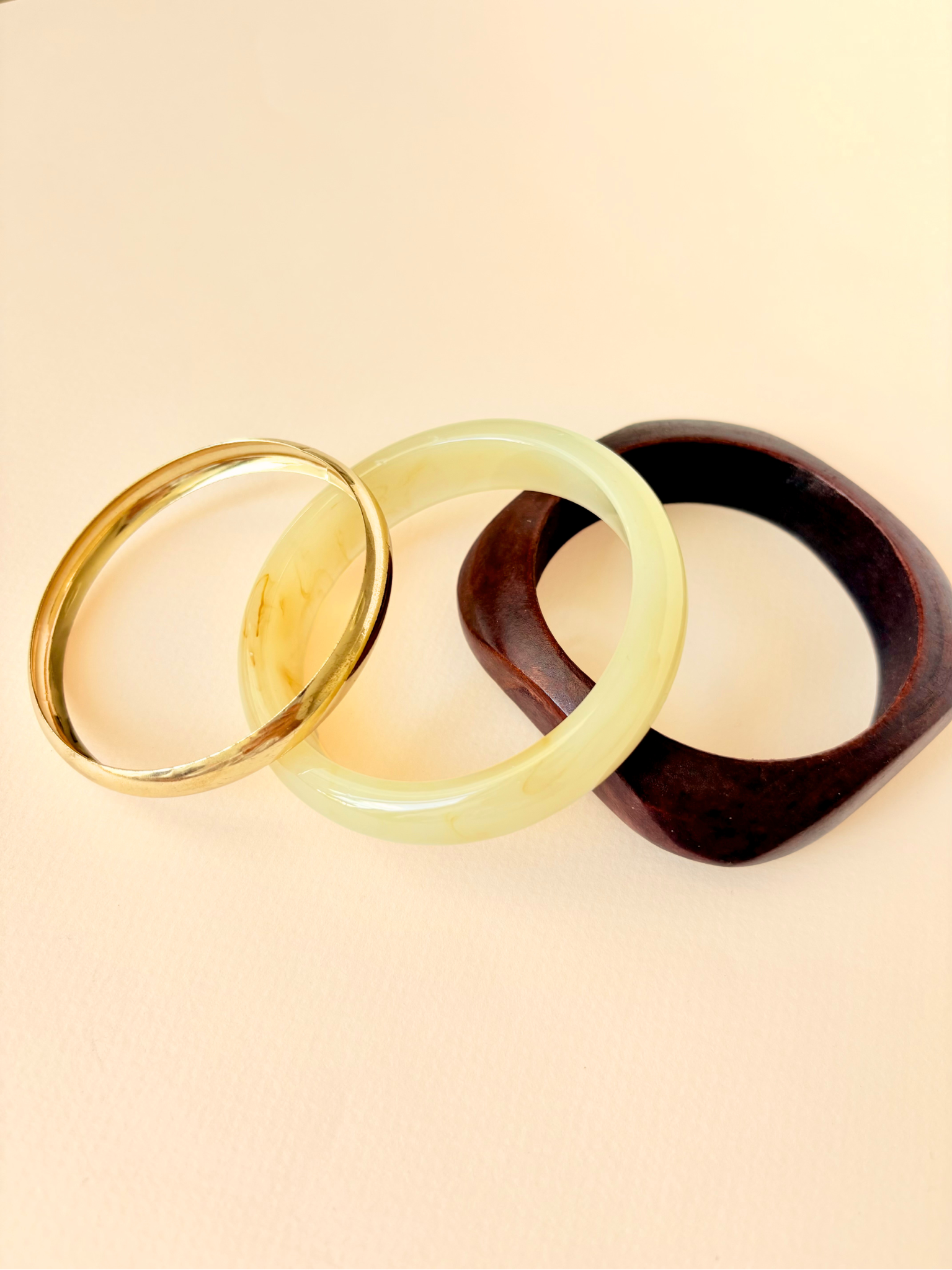 Affirmez votre singularité avec ce trio de bracelets aux matières contrastées et au style affirmé. Mariant l’éclat d’un bracelet doré minimaliste, la douceur d’un jonc en résine ivoire et l’authenticité d’un jonc sculpté en bois foncé, cette composition joue sur les textures pour illuminer vos gestes avec naturel et sophistication.