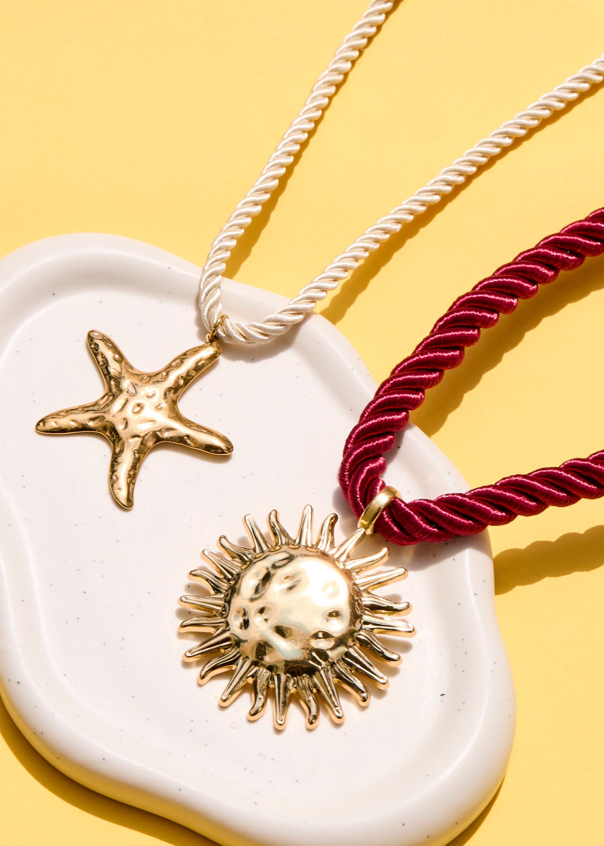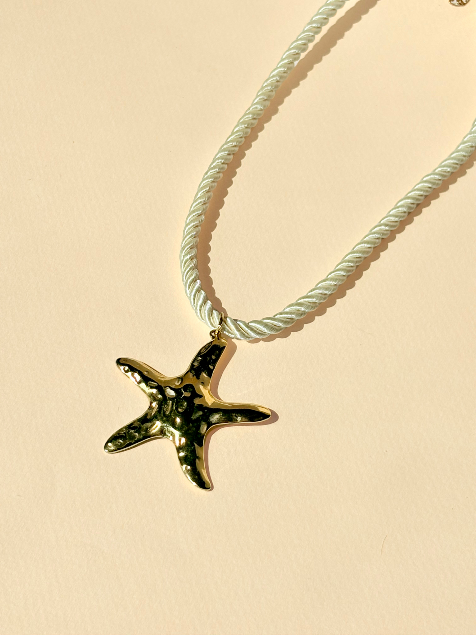 Ajoutez une touche de lumière subtile à votre tenue avec le collier Stella, une pièce à la fois délicate et éclatante. Conçu avec une corde torsadée blanche immaculée et un pendentif doré en forme d’étoile, ce bijou incarne la pureté, la féminité et l’élégance céleste.